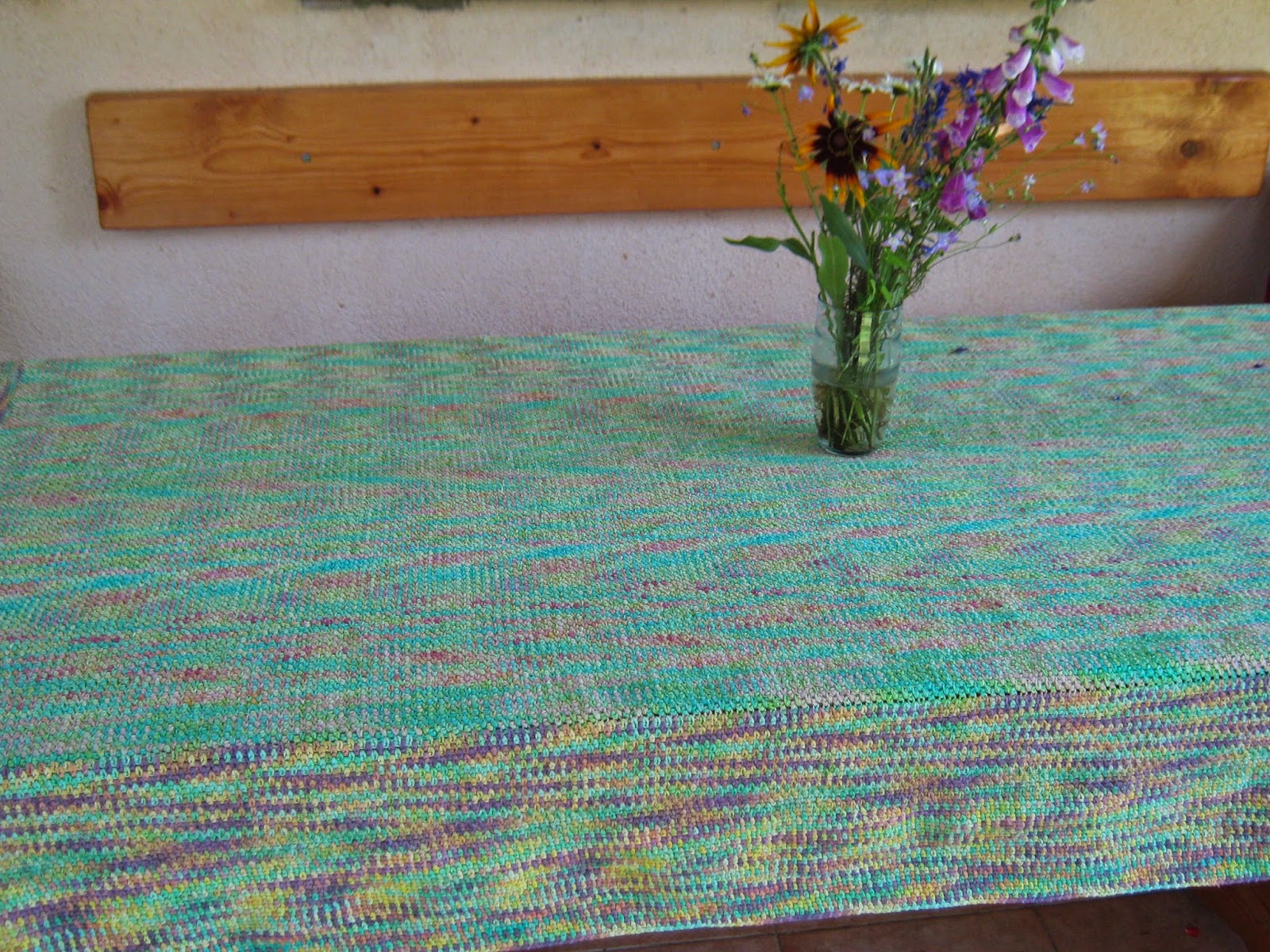 Först skulle den bli en filt men jag tyckte att den var så fin och dessutom behagligt mjuk för armbågarna att jag bestämde mig att ha den som bordsduk.